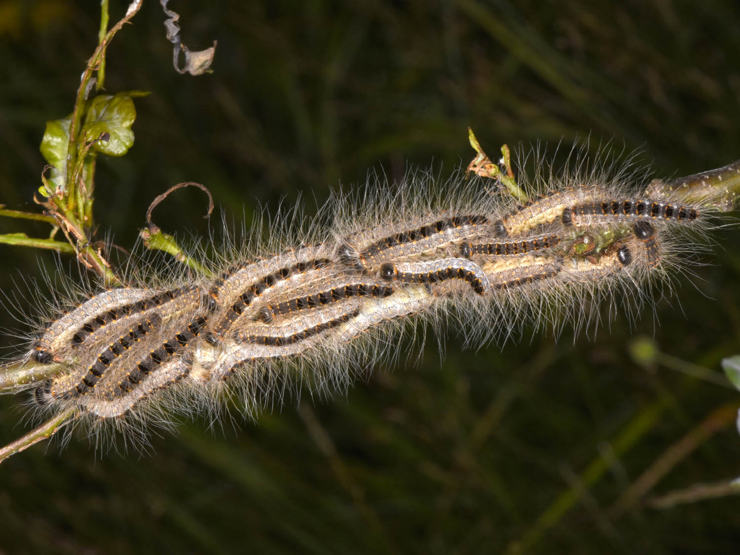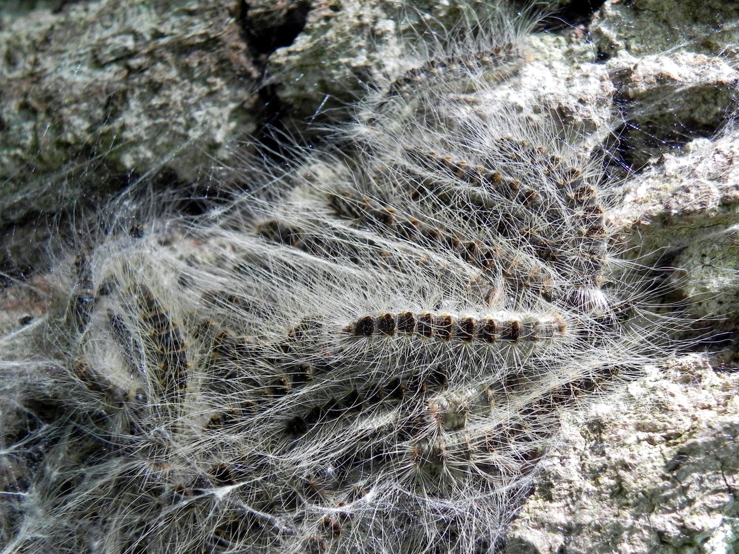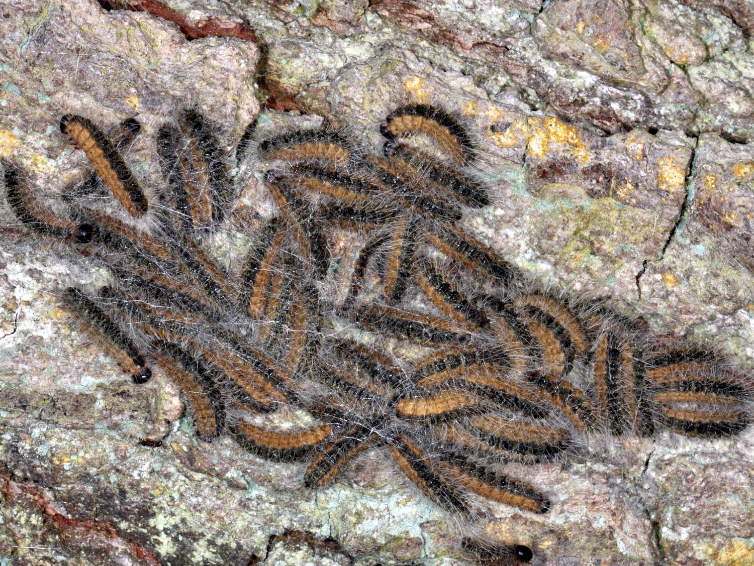 Commentaires : Contrairement à la Processionnaire du Pin, cette espèce passe l'hiver à l'état d'oeuf et les chenilles (également urticantes) vivent au printemps dans des bourses situées sur les troncs des chênes.