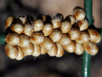 On aperçoit les poils de la femelle collés sur les oeufs.