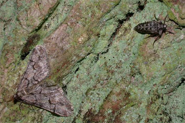 Je suis tout de même surpris de ne pas voir l'Hibernie grise (Agriopis leucophaearia), une espèce qui chaque hiver se révèle abondante. De plus, j'avais noté cette année une prolifération de ses chenilles au printemps. Je persévère donc, en inspectant plus particulièrement les chênes, plante nourricière favorite de l'espèce. Bingo : sur le tronc d'un chêne, en effet, voici un accouplement (qui se sépare dès qu'il me voit). Ce sont les deux seuls représentants de l'espèce que je verrai.
