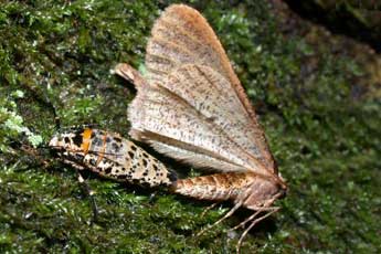 Effectivement, il me faut moins de cinq minutes pour trouver ma première femelle. Elle est agrippée à un tronc à près de deux mètres cinquante de hauteur. La femelle de cette espèce se distingue immédiatement de celle des autres Hibernies, par la forme caractéristique de ses moignons d'ailes. D'abord, c'est chez l'Hibernie hâtive que ces moignons sont les plus développés. Ensuite, fait original, les moignons postérieurs sont nettement plus longs que les moignons antérieurs. Ces ébauches d'ailes portent des dessins qui évoquent vaguement ceux du mâle. Il semble que la couleur des femelles soit très variable, à en juger par la demi-douzaine de femelles que j'ai pu observer.